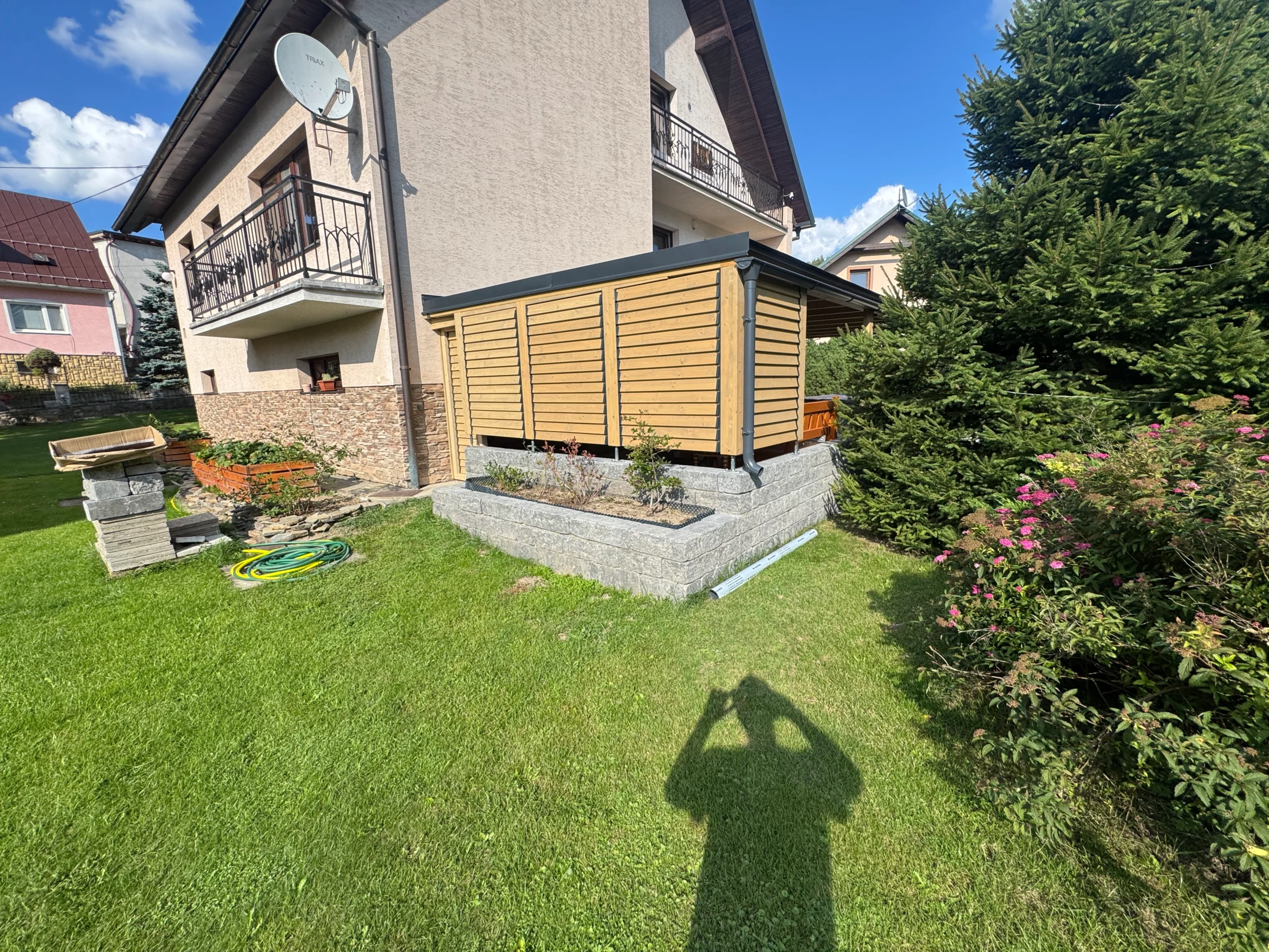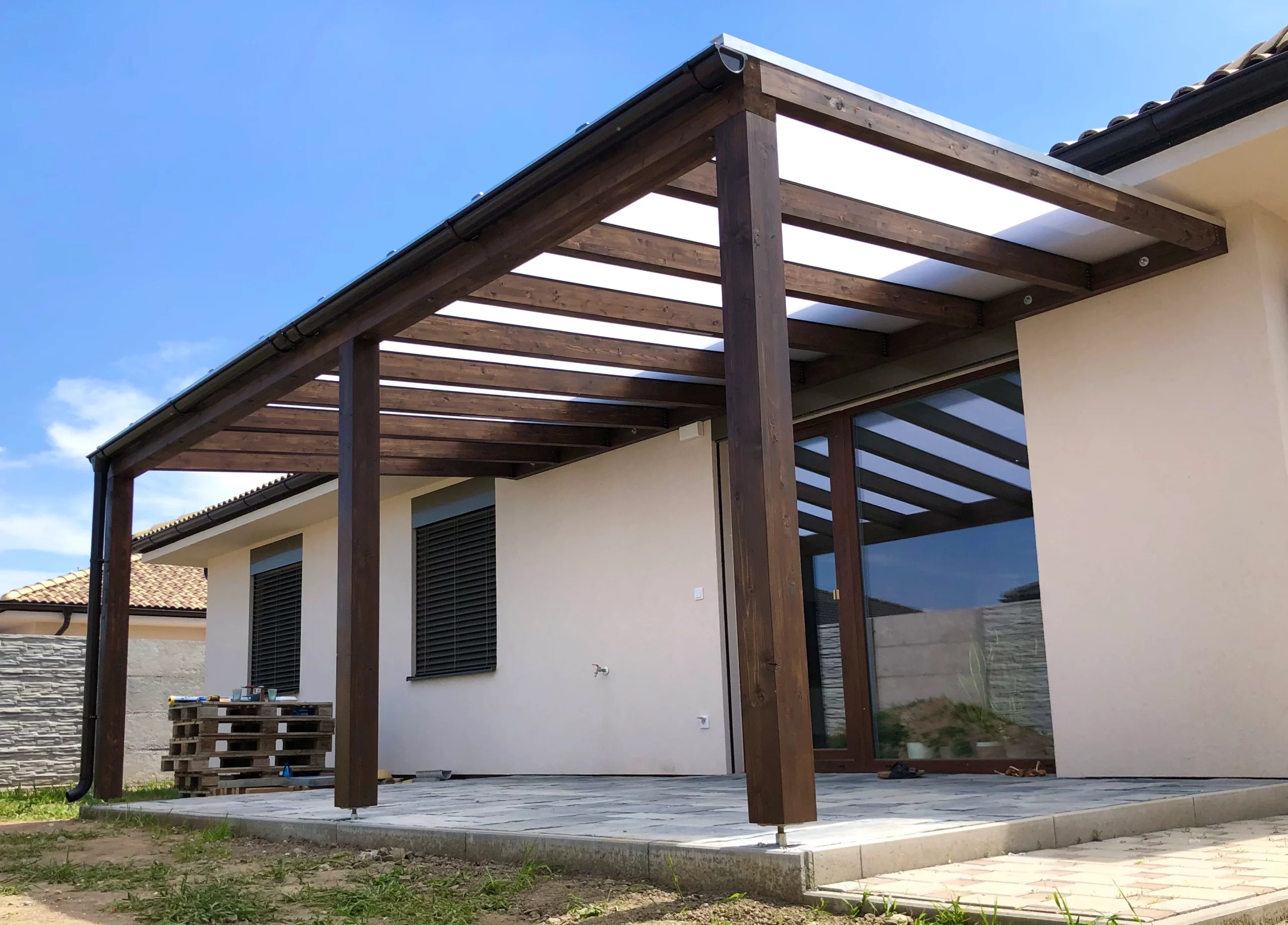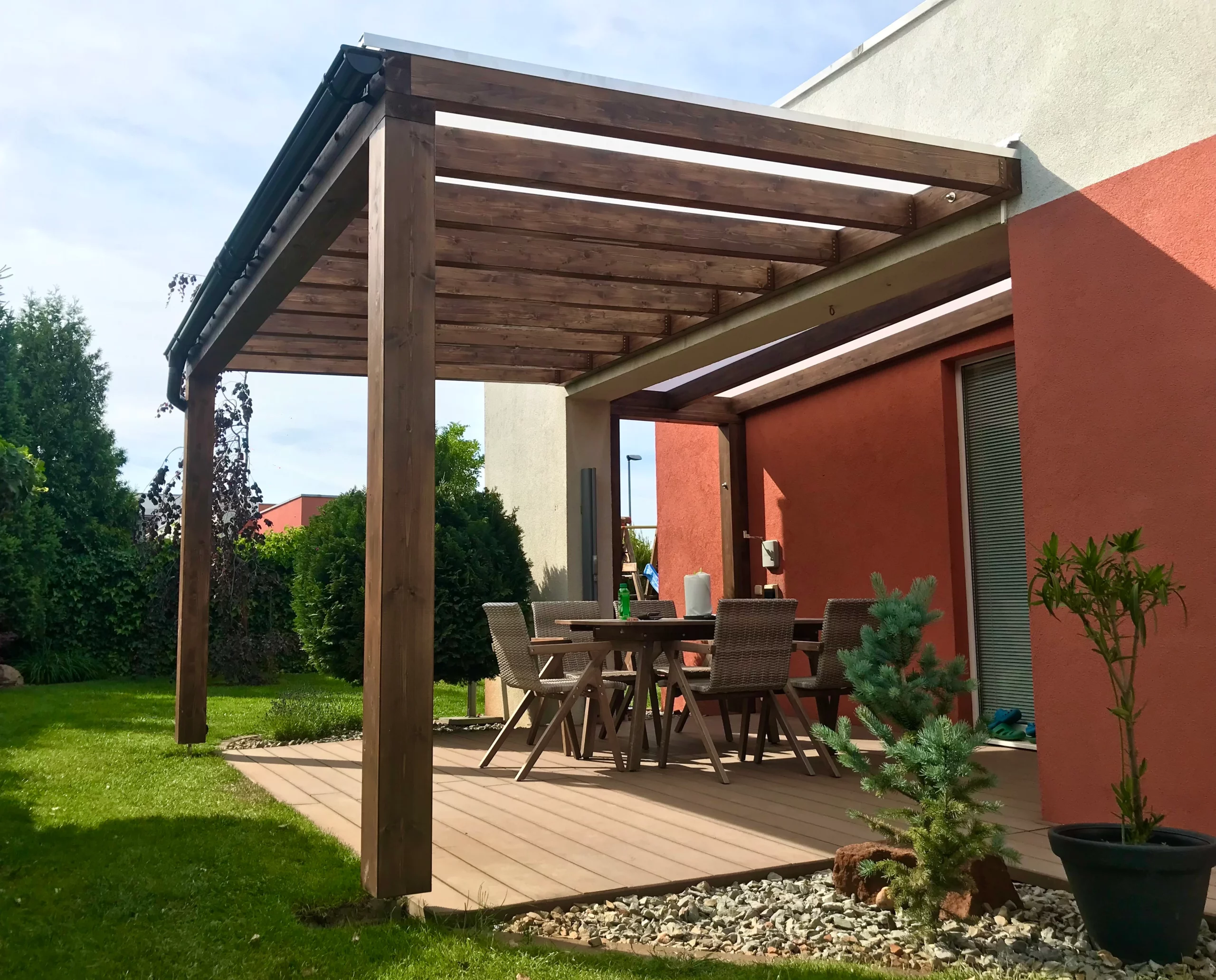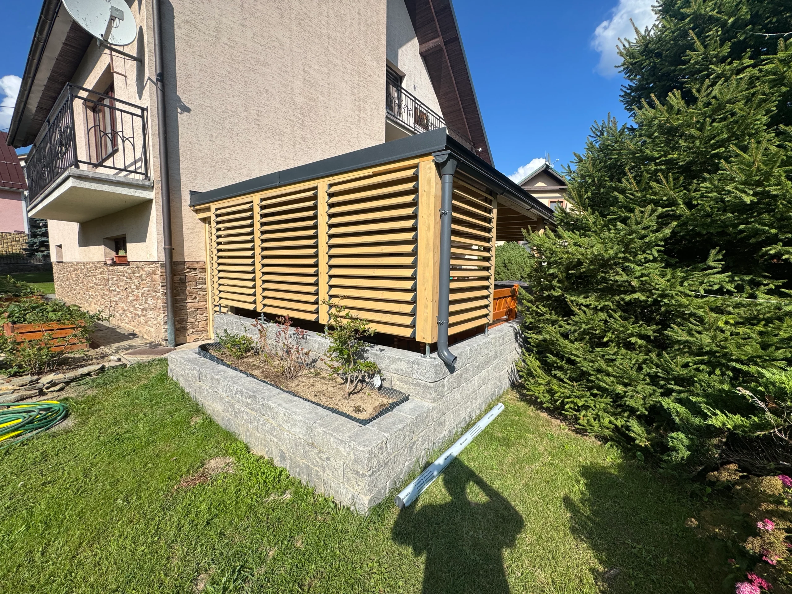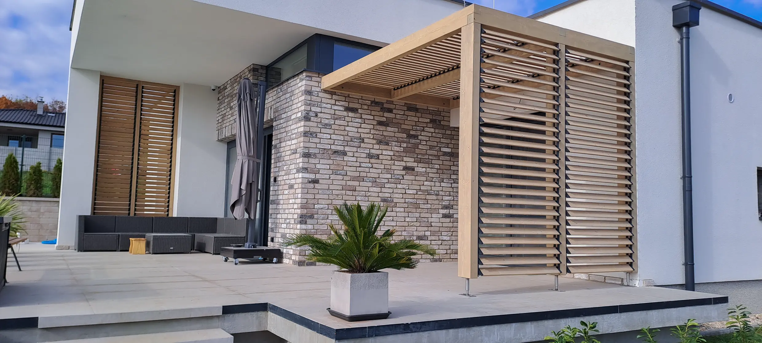 Slnolamy na požiadanie – otočné žalúzie integrujeme hneď, alebo pergolu pripravíme na neskoršie doplnenie.
