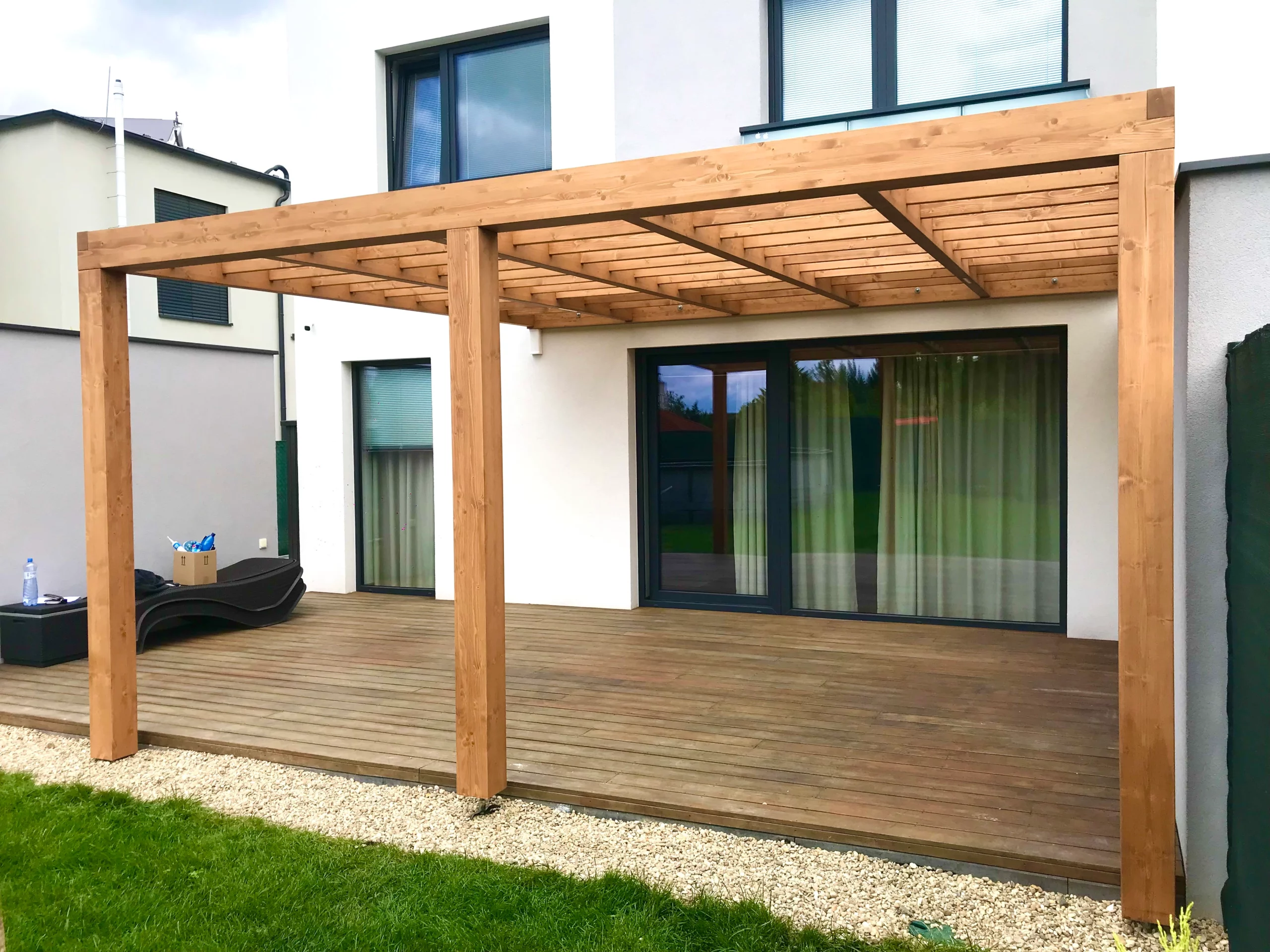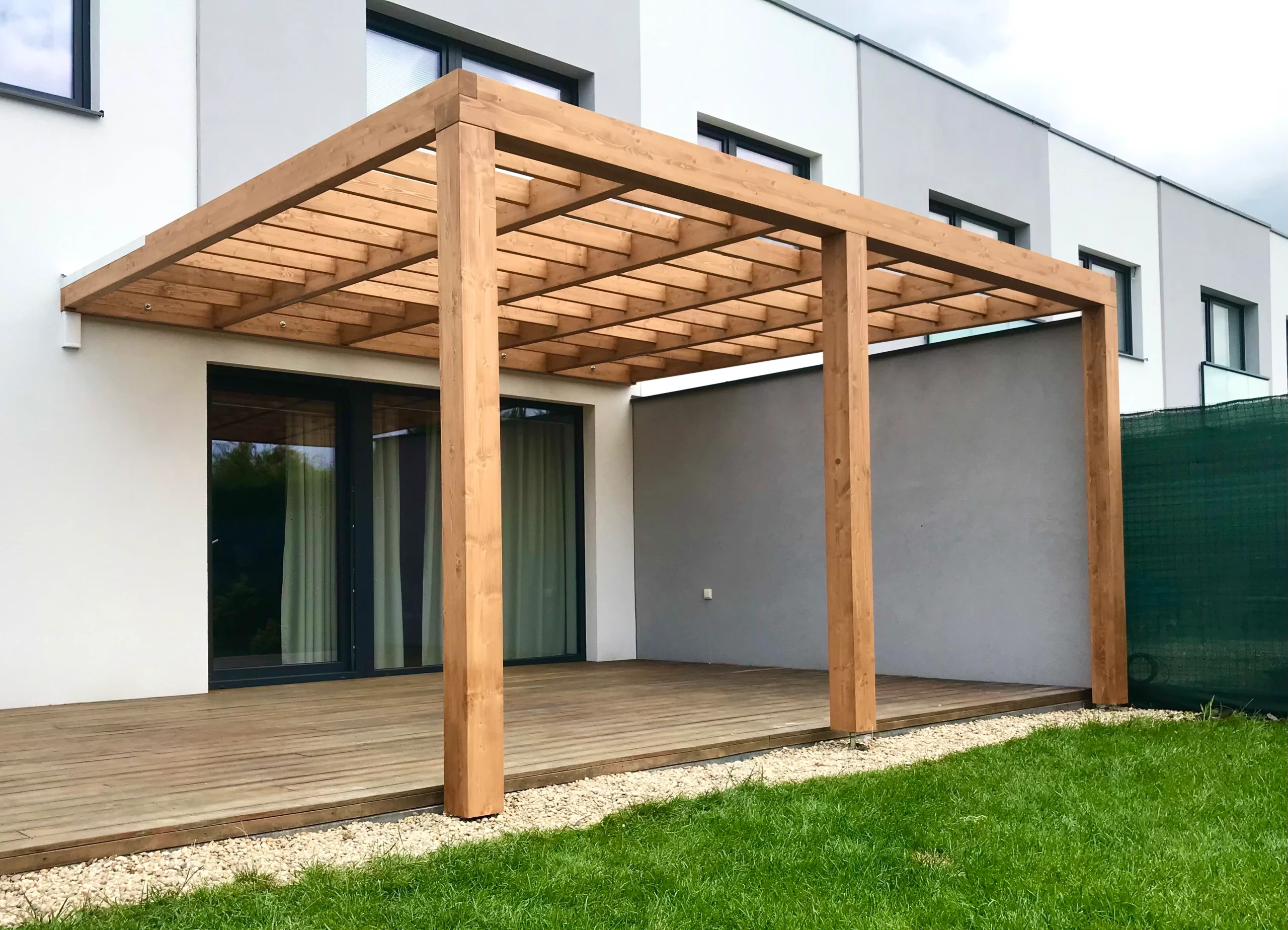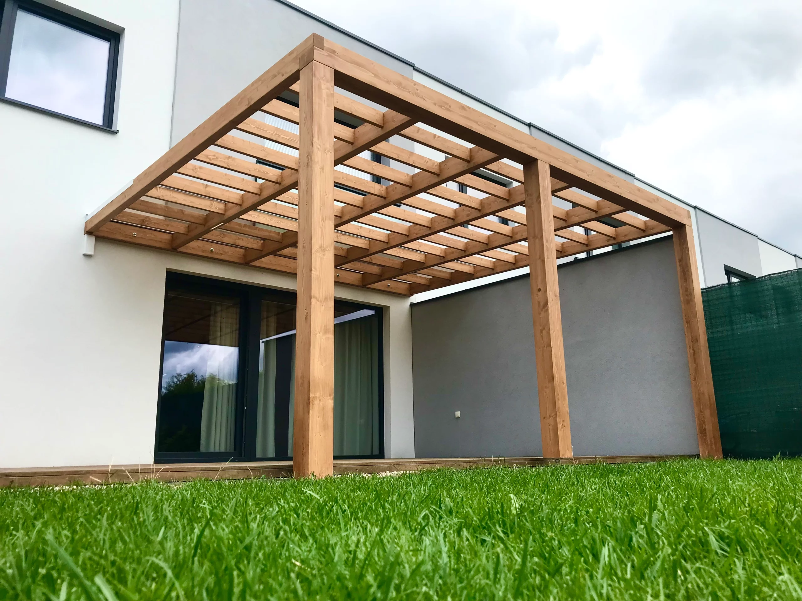 Pergoly staviame z BSH lepených hranolov – pre pevnosť, tvarovú stálosť a dlhú životnosť. Zložité detaily a presné spoje riešime CNC obrábaním. Pergoly môžeme dodať s integrovaným tienením – otočné žalúzie (slnolamy) navrhneme a osadíme už pri výrobe alebo pergolu prepripravíme na neskoršie doplnenie slnolamov (kotviace body).