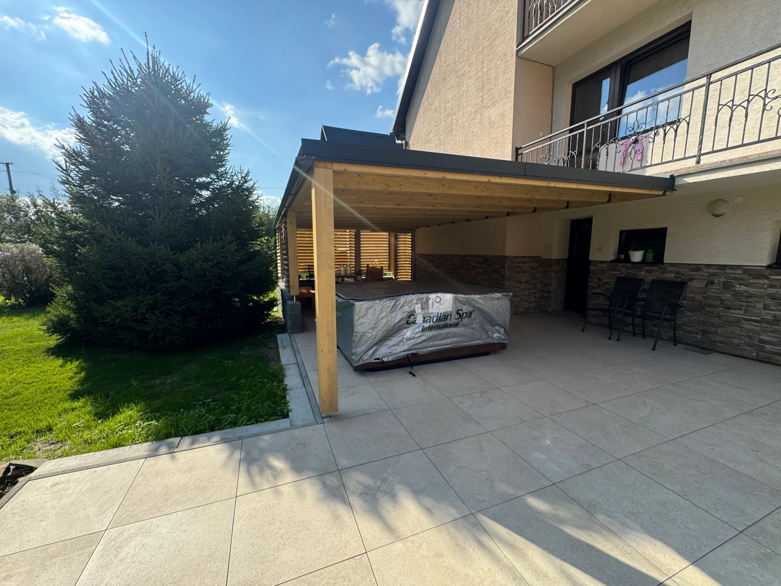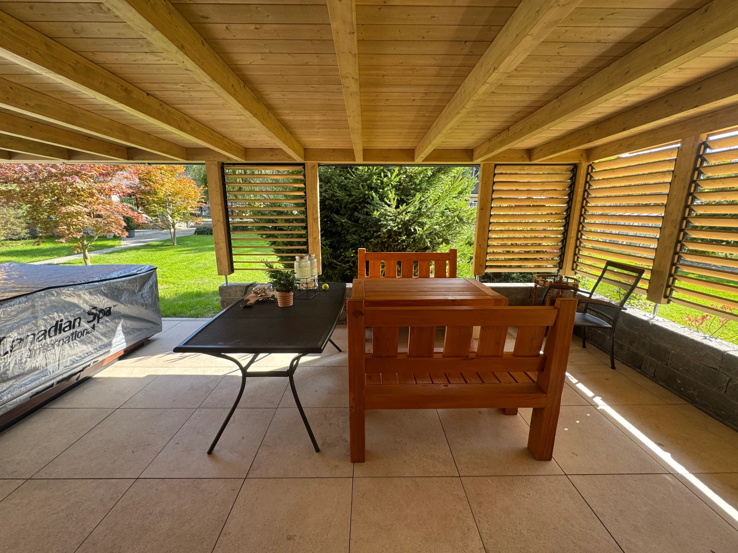 Tienenie: Tienenie: pergolu môžeme dodať s integrovanými otočnými žalúziami (slnolamami) alebo so screenovými roletami (ZIP screen)