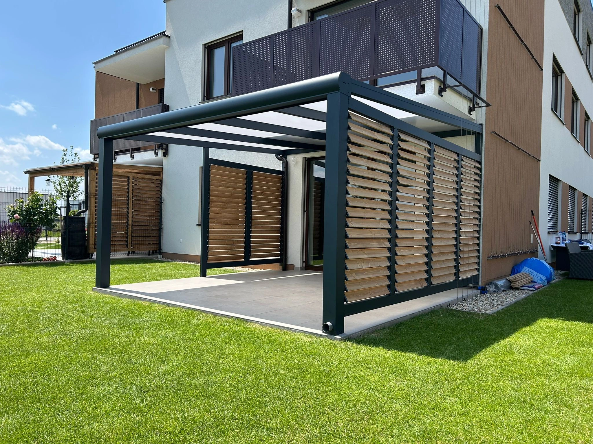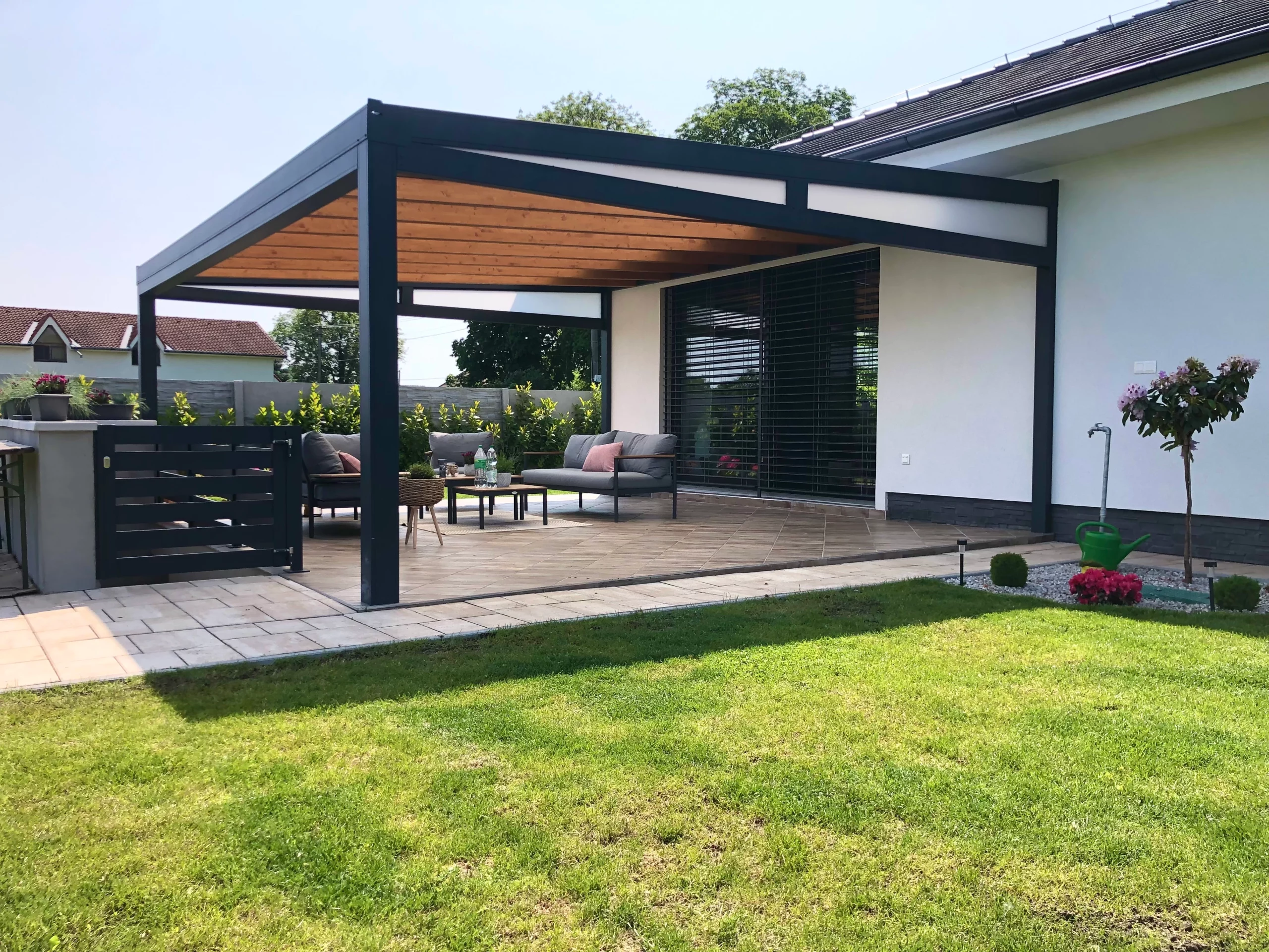 Tienenie: pergolu môžeme dodať s integrovanými otočnými žalúziami (slnolamami) alebo so screenovými roletami (ZIP screen)